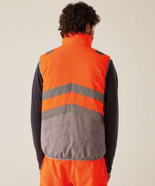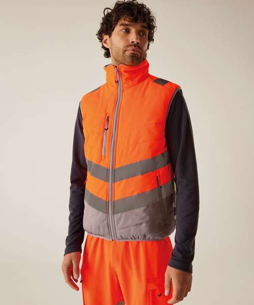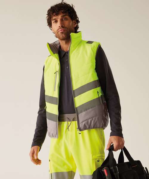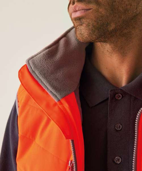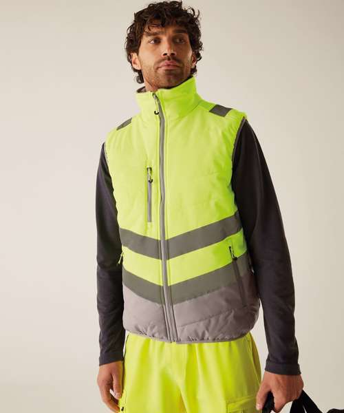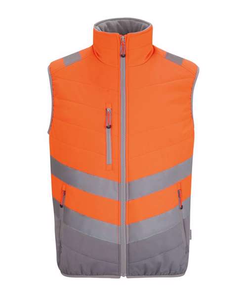 Lightweight four-way stretch outer fabric with durable water-repellent finish. Warmloft insulation, 160gsm. Certified to EN ISO 20471:2013+A1:1026 Class 1. One zipped chest pocket and two lower zipped pockets. Internal pocket. Fleece-lined collar. Stretch binding to armholes and hem. Concealed inner zip for embroidery access. Darker contrast panels, ideal for dirty environments.