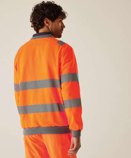 100% Polyester brushed-back fleece fabric, 280gsm. Certified to EN ISO 20471:2013 A1:2016 Class 3. Orange colourway is also certified to RIS-3279-TOM. Ribbed collar, hem and cuffs. Crew neck. Contains recycled polyester.