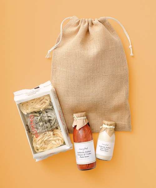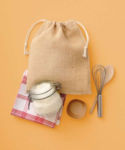 100% Jute, 300gsm. Double drawcord closure. Natural ties.