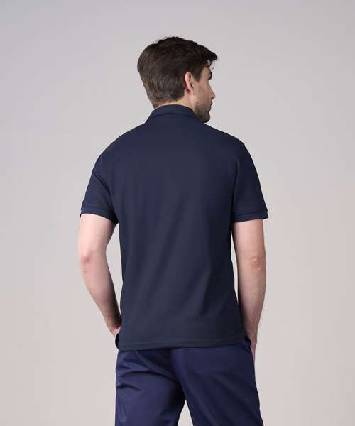 Standard fit. Permanent wicking finish. Antibacterial finish. Recycled polyester. Ribbed collar and cuffs. Twin-needle stitching details. Three-button placket with one spare button.