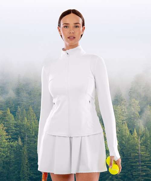 Women’s fitted, high-stretch sports jacket made with recycled fabrics. Ideal for tennis and all sports. Thumb cuff prevents sleeve roll and adds to palm protection.