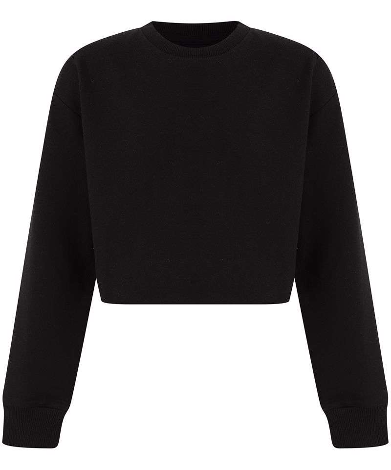Tear-out label. Oversized sweatshirt with cropped raw hem. Set-in sleeves, with dropped shoulders. 2x2 ribbed neck and cuffs. Single Jersey back neck tape.
