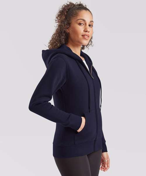 Ideal for work, tourism, event, leisure or casualwear, the women's Premium hooded sweat jacket is available in a range of colours and features a double fabric hood and covered metal zip for enhanced printability. Details include a self-coloured flat drawcord and two front pockets, while a single Jersey back neck tape and cotton/elastane waist and rib cuffs provide easy movement and everyday comfort. This garment also has shaped side seams for a feminine fit.