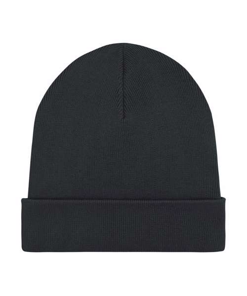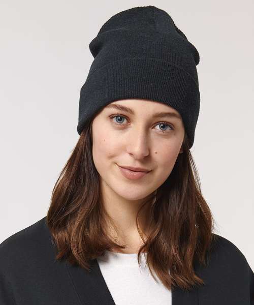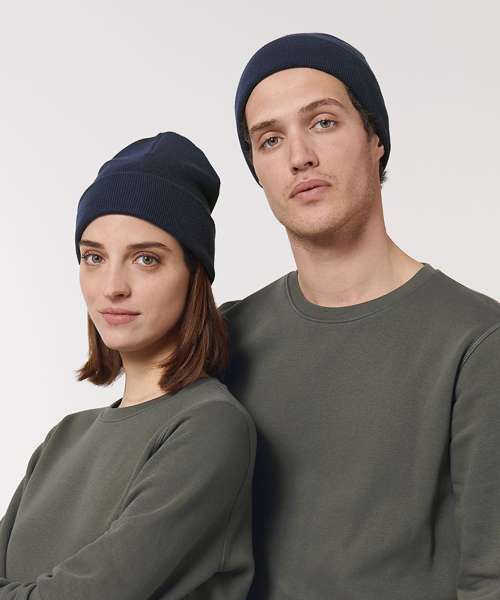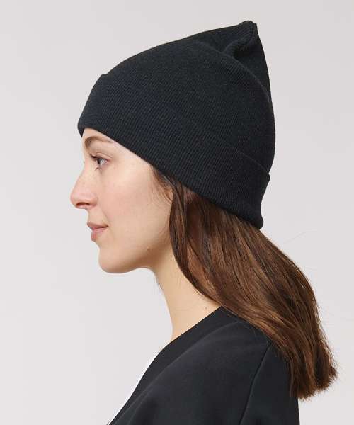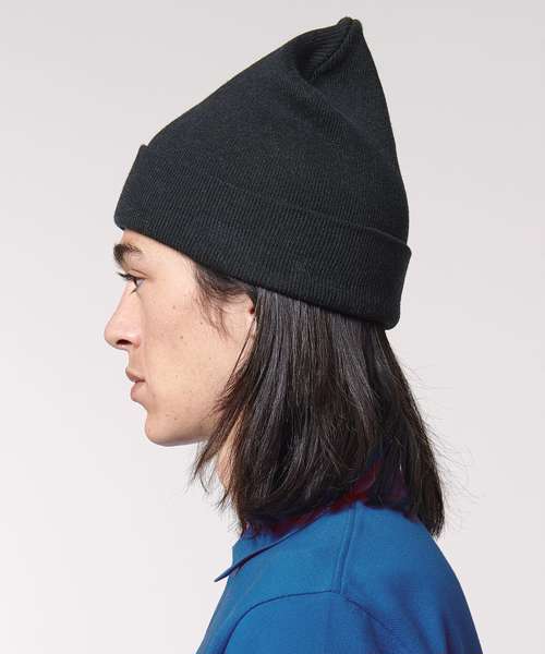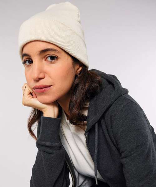 1x1 rib beanie with two layers and foldable brim made of organic cotton and recycled polyester. Unisex fit, in a wide range of colours.