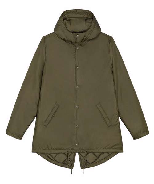Unisex padded parka jacket. Set-in sleeve. Metal snaps at centre front. Welt pockets at front. Round drawcords at bottom hem. Semi-elastic sleeve cuff. Double layered hood with adjustable plastic stopper and elastic cord on inside. Diamond quilting on inside lining. Inside zip opening at bottom hem and wearer’s left chest for easy decoration.