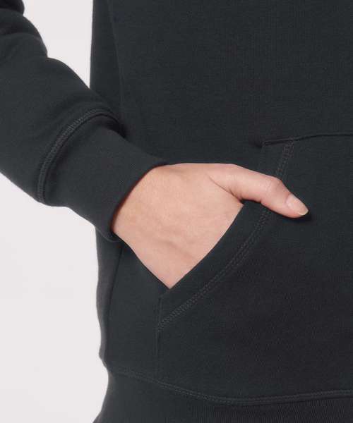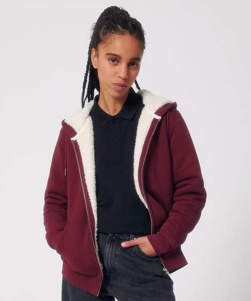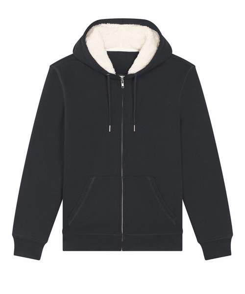 Unisex sherpa lined zip-through hoodie sweatshirt. Set-in sleeve. Lined hood in recycled sherpa. Round drawcords in matching body colour with metal tipping. Metal eyelets. Inside herringbone back neck tape in greige colour. Self-fabric half-moon at back neck. Covered metal zip at centre front. 1x1 rib at sleeve hem and bottom hem. Armhole, sleeve hem and bottom hem with twin-needle topstitch. Kangaroo pocket at front. Fully lined with recycled sherpa inside chest pocket. Inside invisible zip at bottom hem for easy decoration.