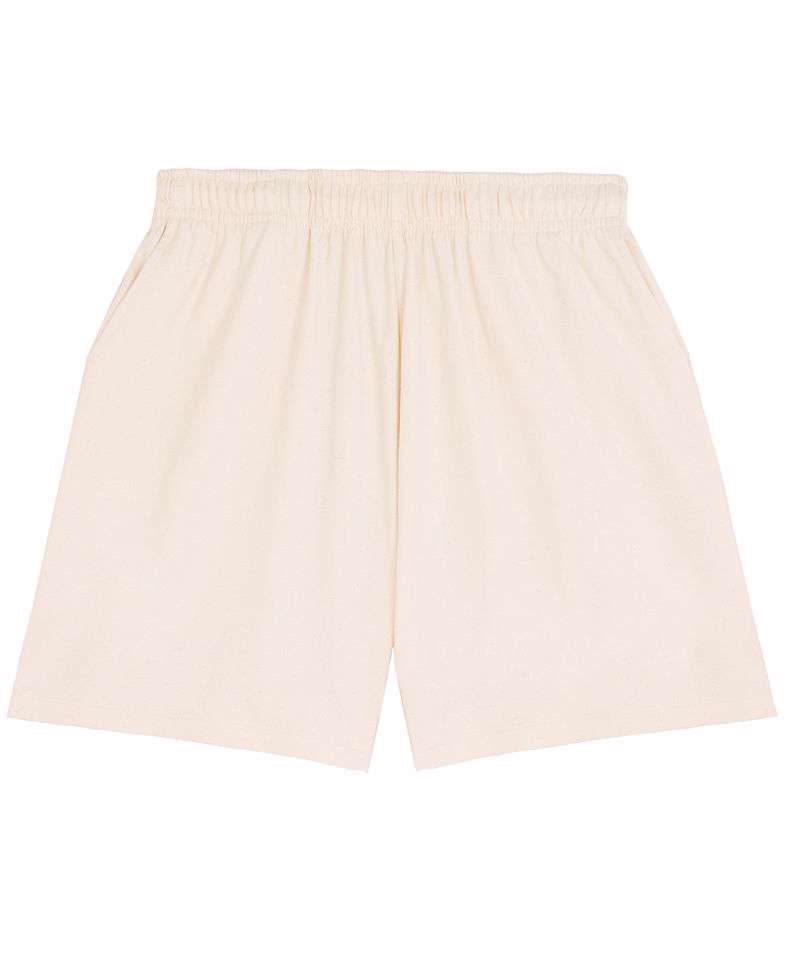 Unisex lightweight shorts with self-fabric elastic waistband. Hidden flat drawcords on the inside of the waistband. Pockets at the front and patch pockets at the back.