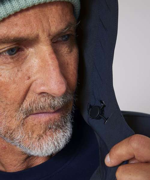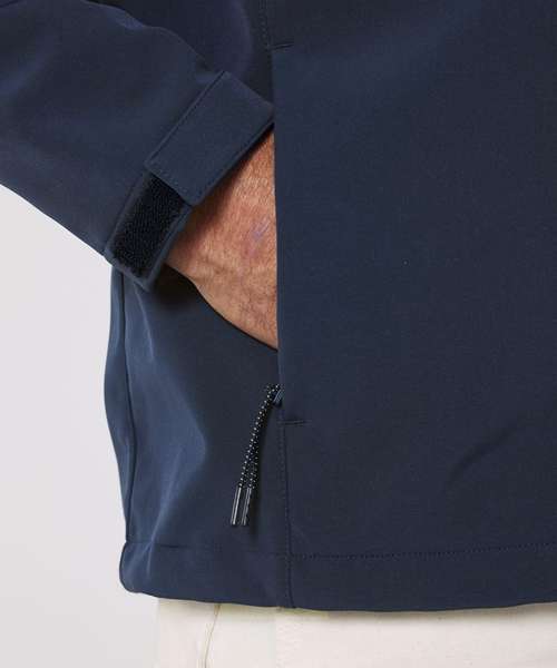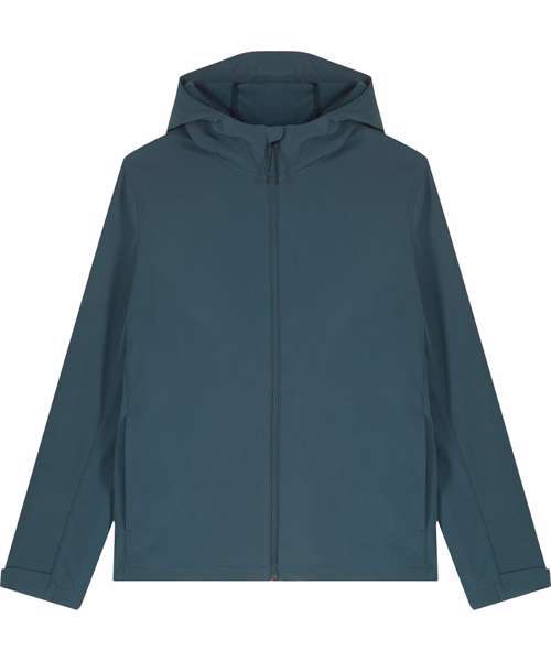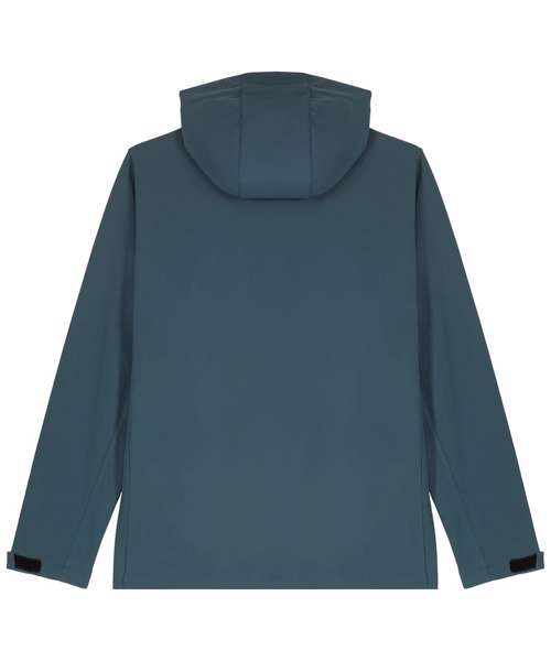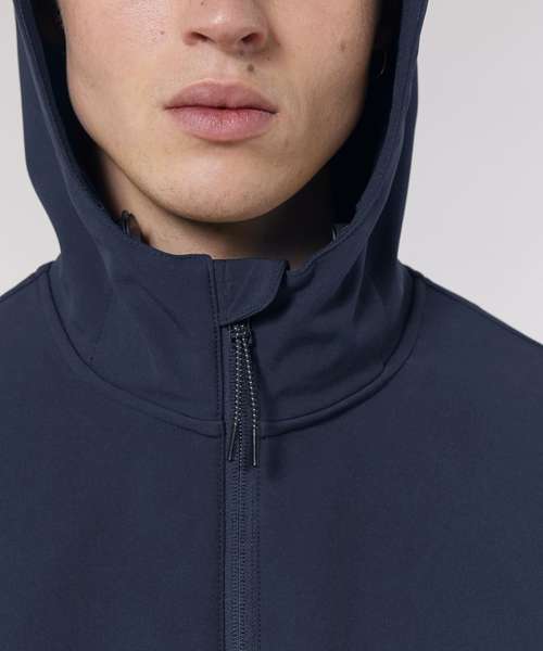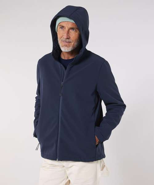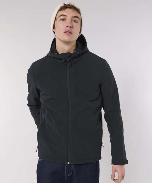 Men’s hooded softshell jacket, medium fit, with set-in sleeve and a high collar with panelled hood. Hood opening and bottom hem with adjustable plastic stopper and elastic cord. Reverse nylon zip at centre front. Zipped welt pockets with reflective elastic puller. Bonded three-layer fabric with internal membrane . Fully bonded fleece inside layer. Side panels and stretch for better shape. Adjustable hook and loop sleeve opening. Inside seams finished with recycled binding. Water-repellent up to 10,000mm, breathability up to 3000G/M2/24hrs allowing perspiration to escape. Windproof. Bionic ECO DWR (durable, water-repellent) finish.