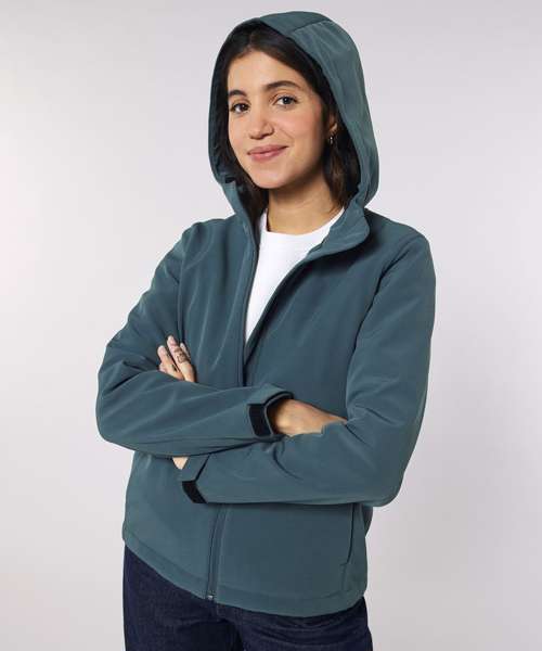 Women’s hooded softshell jacket, medium fit with set-in sleeve, high collar and panelled hood. Hood opening and bottom hem with adjustable plastic stopper and elastic cord. Reverse nylon zip at centre front. Zipped welt pockets with reflective elastic puller. Bonded three-layer fabric with internal membrane. Fully bonded fleece inside layer. Side panels and stretch for better shape. Adjustable hook and loop sleeve opening. Inside seams finished with recycled binding. Water-repellent up to 10,000mm, breathability up to 3000G/M2/24hrs allowing perspiration to escape. Windproof. Bionic ECO DWR (durable, water-repellent) finish.