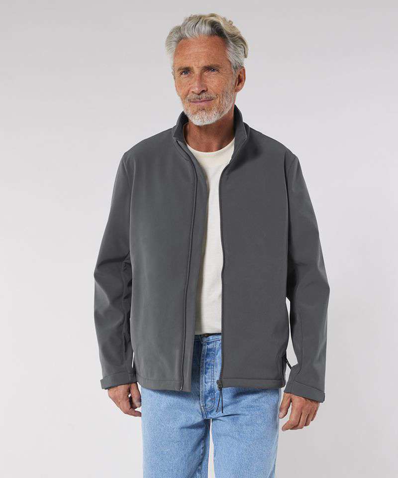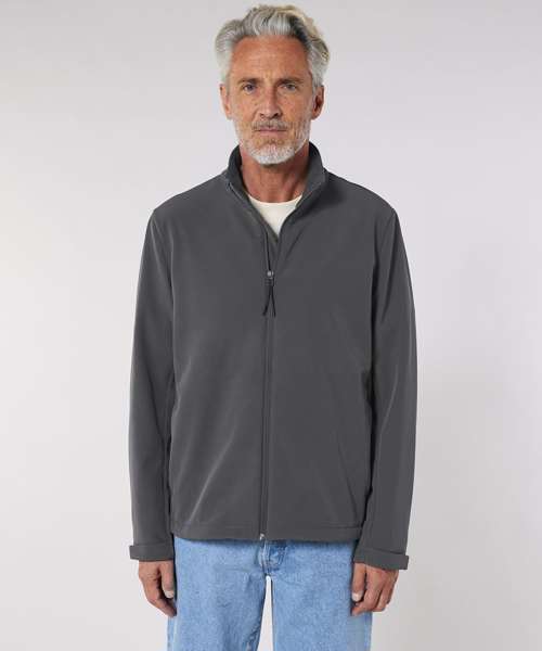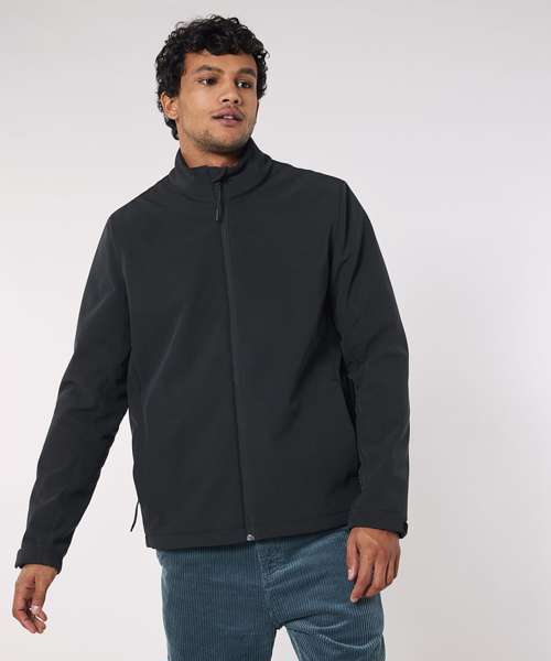 Men’s softshell jacket, medium fit with a high collar and set-in sleeve. Bottom hem with adjustable plastic stopper and elastic cord. Reverse nylon zip at centre front. Zipped outside welt pockets with reflective elastic puller. Fully bonded inside fleece layer. Side panels and stretch for better shape. Adjustable hook and loop sleeve opening. Inside seams finished with recycled binding. Water-repellent up to 10,000mm, breathability up to 3000G/M2/24hrs allowing perspiration to escape. Windproof. Bionic ECO DWR (durable, water-repellent) finish.