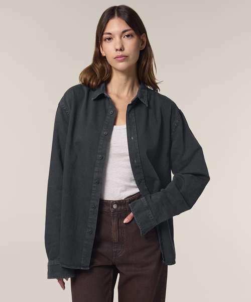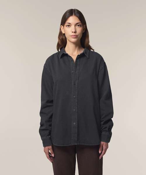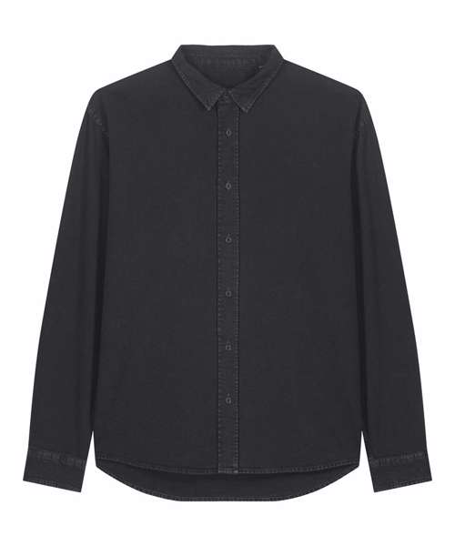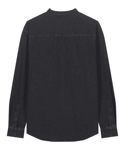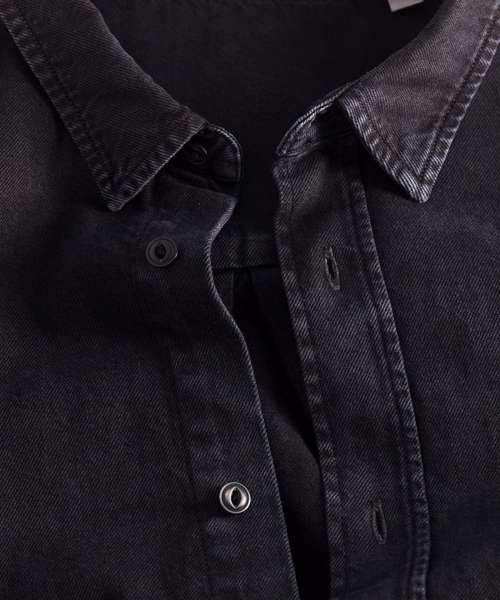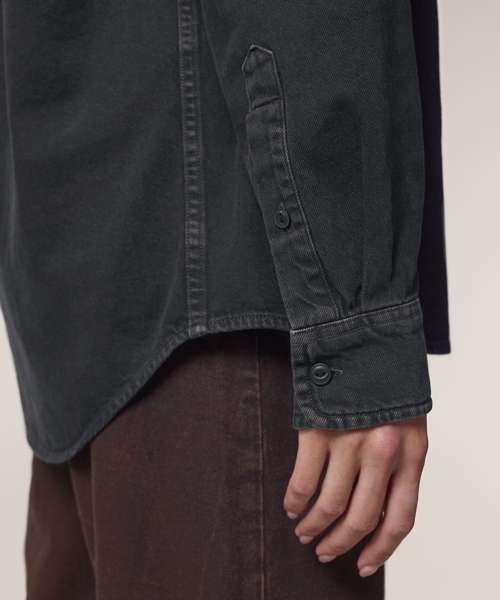 The Worker shirt. Relaxed unisex fit. Point collar with single-needle topstitches. Collar stand. Front placket with single-needle topstitches on each side. Forwarded shoulder. Back yoke. Inside yoke in self-fabric. Set-in sleeves. Sleeve placket with one button. Cuff with two buttons. Rounded cuff corners. Double pleats at cuff seam. Garment-Dyed Black Rock colour has a faded look on all seams due to garment washing. Garment-dyed product, so each garment may vary in appearance and colour may bleed – follow our care label. Read print recommendations carefully.