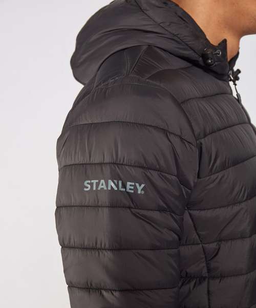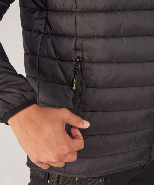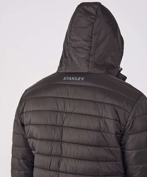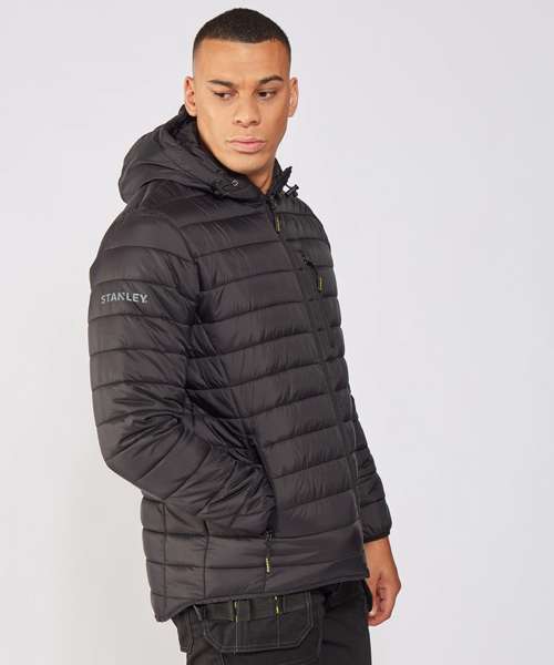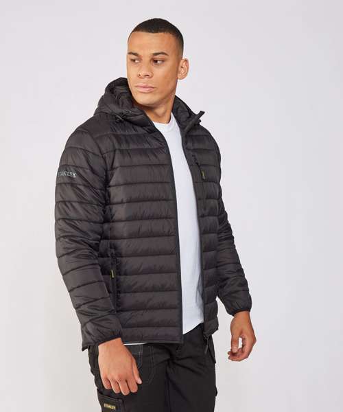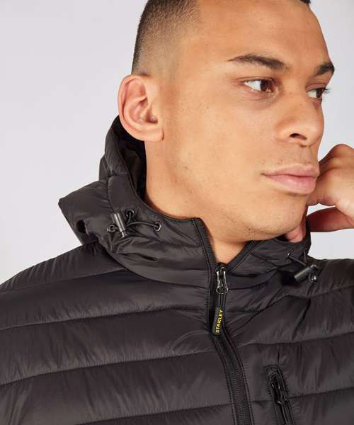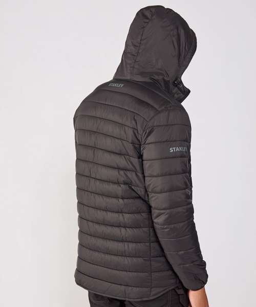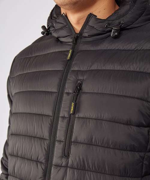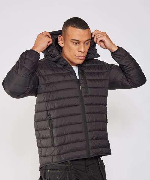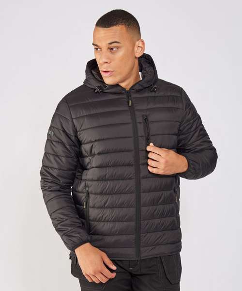 Insulated zip-through jacket with hood, chest pocket and narrow baffles. Water-resistant. Zipped pockets. UKAS certified. ISO certified.