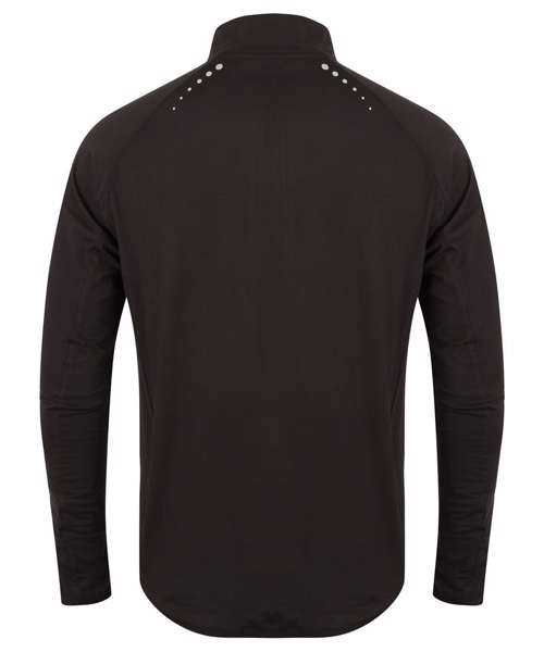 ¼ zip Jersey top with wicking finish. Long sleeves with thumbhole and fold over cuffs. Elasticated binding on cuffs and hem. Raglan shoulder seams with flatlock stitching and reflective dots detail on back of garment. 1/4 length zip with reflective trim and semi-automatic lock zip slider. Stand up self-fabric collar. Side panels. Key pocket on left back panel seam with concealed zip and inner headphone access hole. Tombo tear-out label.
