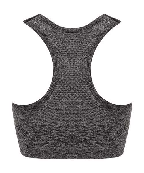 Seamless bra with removable padded cups and racerback. Self- fabric mesh inserts on front straps, V insert on front and on racerback panel. Self-fabric binding around neck, armholes and back. Tombo tear-out label.