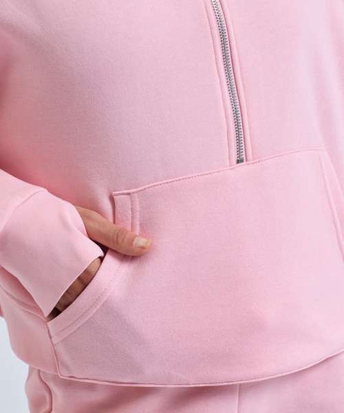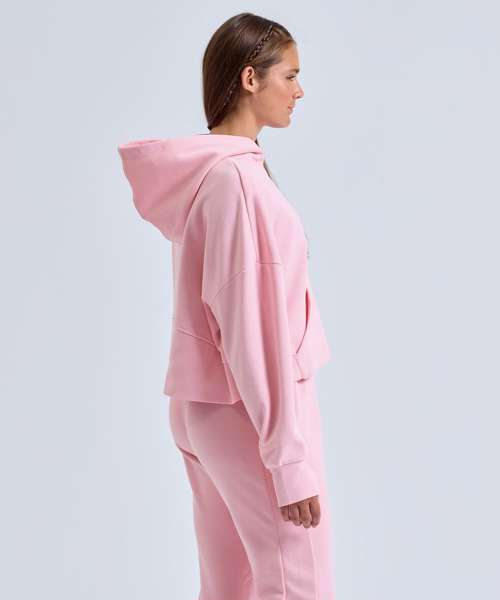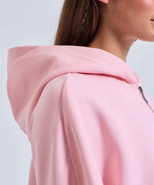 Oversized hooded sweatshirt with high-shine 1/2 zip detailing to neck. Kangaroo pockets to front. Ribbed cuffs with thumbhole detailing. Panel detailing to back with curved hem design that wraps round to front. Brushed-back fleece inner. We recommend using block out vinyl and inks.Product contains no branded neck or waist label. Removable Kimble or looped garment tags. Inner seam label holds important product information on one label with a second label containing brand information which can be cut-away. Contains recycled polyester.