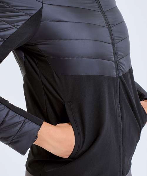 Hybrid jacket with diagonal quilted upper chest and back. Lower jacket is shell fabric. Full zip-through style with panelled hood. Hood is elasticated for a snug fit. Front pockets. Quilted detailing to arms with lower arm in shell fabric. Internal storm flap with zip guard. We recommend using block out vinyl and inks.Product contains no branded neck or waist label. Removable Kimble or looped garment tags. Inner seam label holds important product information on one label with a second label containing brand information which can be cut-away.