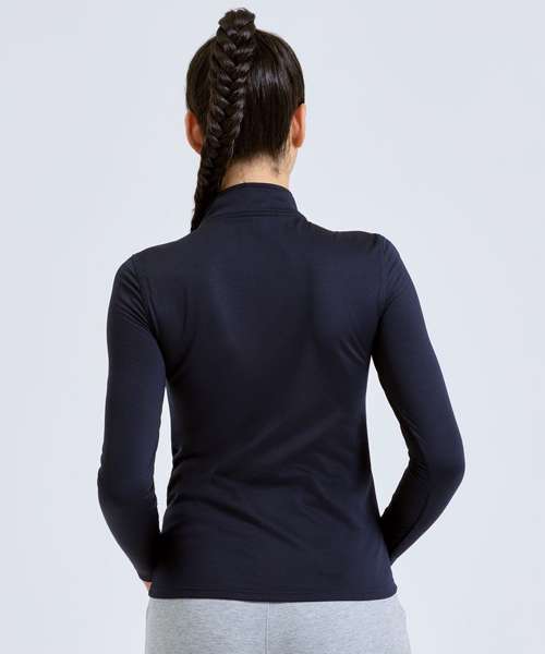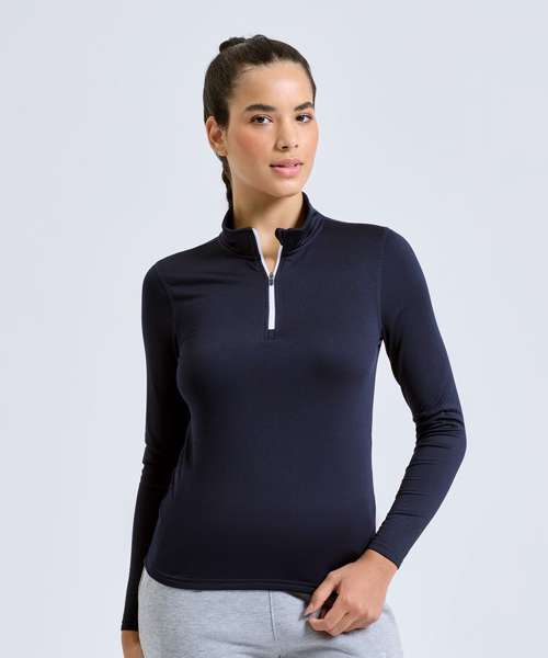 ¼ zip design. Long sleeves. Stretch. Recycled polyester. Wicking fabric. Brushed inner. The product contains no branded neck or waist label. Removable kimble or looped garment tags. The inner seam label holds important product information on one label with a second label containing brand information which can be cut-away. We recommend using block out vinyl and inks.