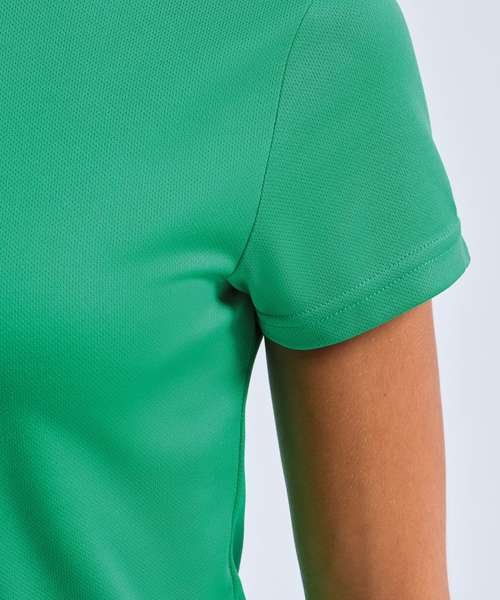 Performance T-shirt. Cationic dyed. Recycled polyester. Wicking fabric. Stretch. Crew Neck. Short Sleeve. Lightweight. Feminine fit. Twin-needle stitching on hem and arms. Textured fabric. Product contains no branded neck or waist label. Removable Kimble or looped garment tags. Inner seam label holds important product information on one label with a second label containing brand information which can be cut-away. UPF 40+.