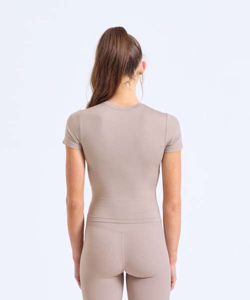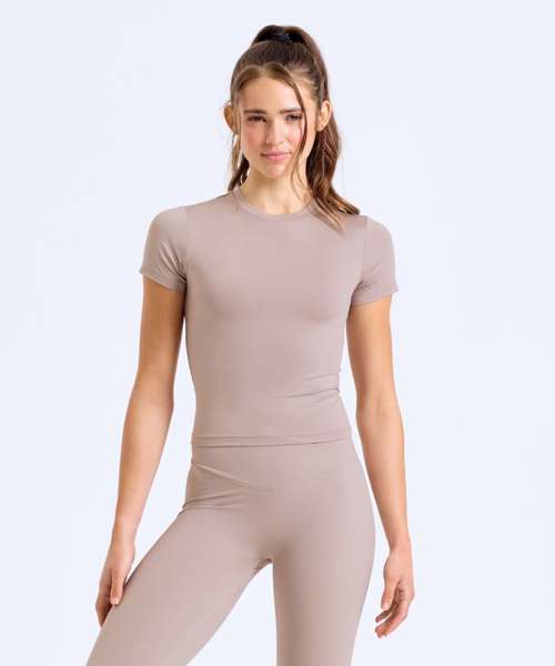Crew neck. Short sleeves. Fitted tee. Certified recycled Polyester. Elastane. Stretch. Smooth finish.