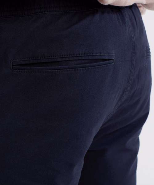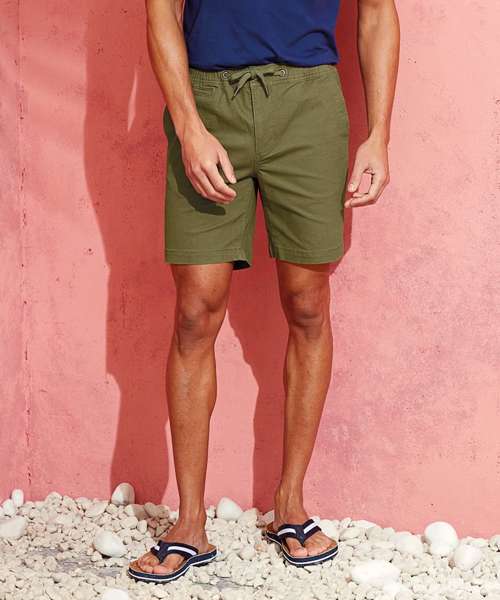 Two swing pockets and two back jet pockets with button fastening to one. Coin pocket. Elasticated waistband with drawstrings. Gunmetal eyelets and caps to drawstrings. Zip fly and button fastening to the front. Soft finish fabric. Shorts can be worn rolled up.